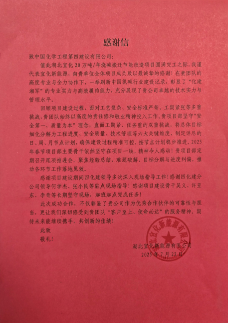 7月22日,中國(guó)化學(xué)四化建收到湖北宜化新能源有限公司發(fā)來(lái)的感謝信,信中對(duì)公司在湖北宜化20萬(wàn)噸/年燒堿搬遷節(jié)能改造項(xiàng)目建設(shè)中的突出表現(xiàn)給予充分肯定和高度贊揚(yáng)。